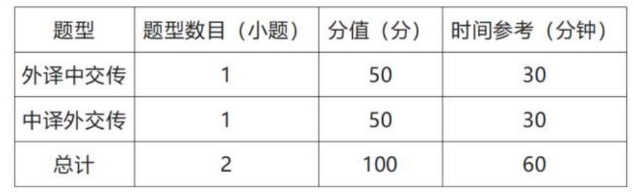 满分为100分,时间为120分钟,共2种题型2道题,全部为主观题。参赛选手可使用中译外、外译中纸质版词典各1本。