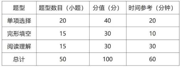 满分为100分,时间为60分钟,共3种题型50道题,全部为客观题。参赛选手不得使用任何纸质词典、电子词典和工具书。