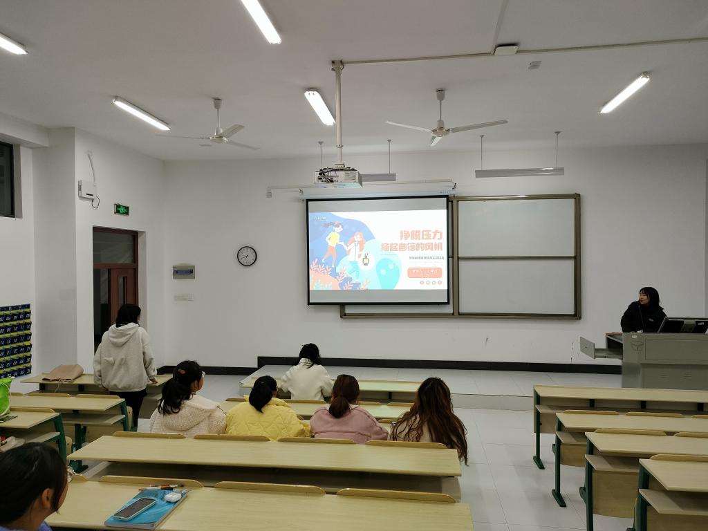 为了营造一个轻松愉快的学习氛围,培养同学们健康积极的生活心态,在辅导员鲁玉婷的指导下,英语2103班全体同学于12月1日18:30在学院楼2506教室开展了“摆脱压力,扬起自信的风帆”的主题班会,本次班会由心理委员王梓力主持。