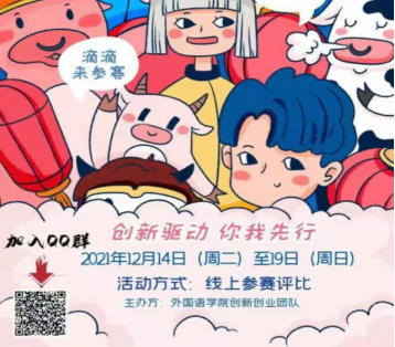 为了激发外国语学院学生创新创业兴趣,更好地开展2022年的创新创业工作,在创新创业团队负责老师鲁玉婷的指导下,外国语学院于12月14日至12月18日举办了“创新驱动,你我先行”的竞赛活动。