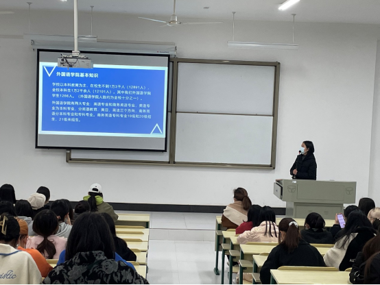 会议伊始,鲁老师就外国语学院基本知识进行了介绍,并向大家详细说明了外国语学院“一院一品”特色项目的含义及内容。她通过提问地形式展开,同学们都听得很认真。