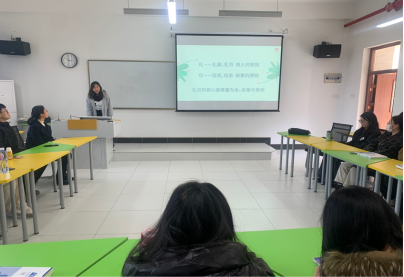 会议初始,李宇航同学先对校园文明礼仪进行了简单的介绍。她提出,礼即礼貌、礼节,是做人的原则;仪即仪式、仪态,是做事的原则。礼仪的核心是尊重为本,不仅要自我尊重,更需要尊重他人。
