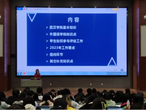 外国语学院团委书记鲁玉婷从武汉学院的基本知识、外国语学院基本知识点、学生如何参与评估工作、2023年工作要点等主要方面进行培训。