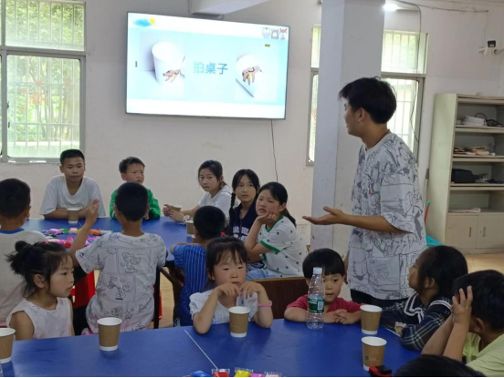 在活动开始前,志愿者团队精心准备了一项特别的引入活动——拍桌子。志愿者饶春阳站在桌子边,鼓掌、拍桌子,跟着音乐的节拍创造出有力的声响。游戏环节立即吸引了小朋友们的注意力。他们纷纷加入到这场充满活力的节奏中。