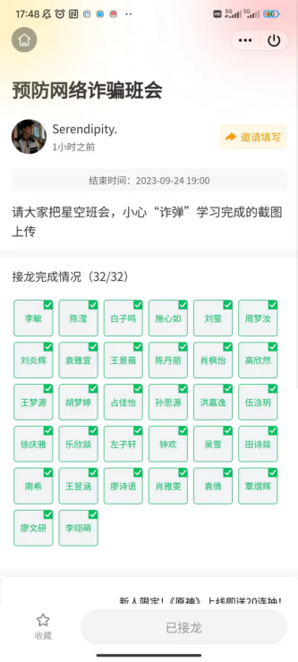 其中,辅导员胡鹏老师利用现代化信息技术开展班会的接龙活动,让学生学完截图上传接龙,通过学生喜爱的现代技术手段,让学生快速且高效的完成防范非法校园贷和电信网络诈骗的学习,深受学生喜爱,轻松实现全覆盖。