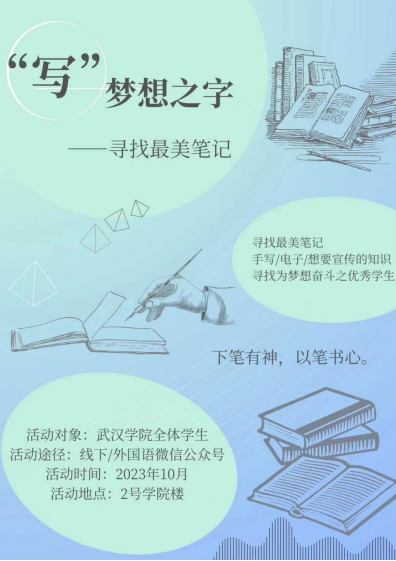 为进一步加强学风建设,营造学院浓郁的学习氛围,充分调动学生学习的积极性,10月20日至10月23日,由外国语学院团学联主办第二期“寻找最美笔记”活动正式拉开帷幕,此项活动面向武汉学院全体学生。