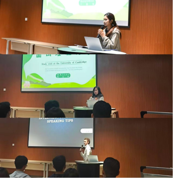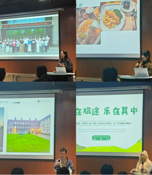 三位参与访学的同学从不同角度分享了他们的收获。英语2304班徐丽娜系统介绍了研学目的、行程安排与注意事项;工程2301班刘泽毅通过精美的照片,带领大家云游剑桥的名胜古迹;会计学2304班杨思雨则从衣食住等生活细节入手,分享了实用的海外生活经验。多元的视角让同学们对访学生活有了更立体的认知。通过真实的课堂案例、丰富的文化见闻和深刻的个人感悟,让在场同学深切感受到了世界顶尖学府的学术氛围和海外学习的独特价值,引发了同学们的浓厚兴趣和热烈反响。