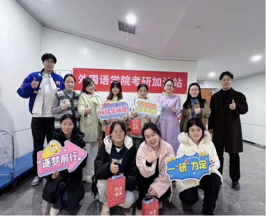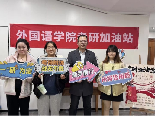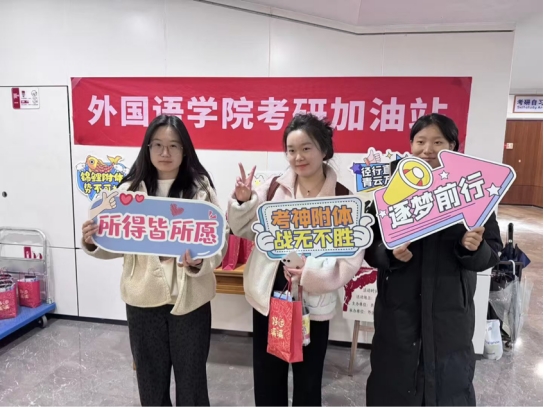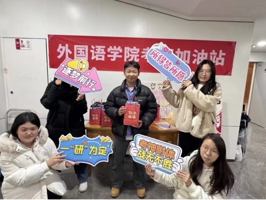 为助力我院考研学子全力冲刺、坚定信心,12月10日中午,外国语学院于图书馆1楼考研自习区设立考研加油站。学院志愿者们早早布置好现场,悬挂励志横幅,摆放精心设计的留言板与祝福手牌,将走廊一角装扮成温馨而鼓舞人心的“加油驿站”。