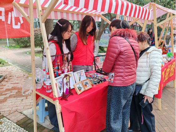与此同时,爱心义卖区秩序井然、人气持续升温。摊位上陈列的手绘书法扇、传统缠花等手工艺品均出自社区居民之手,兼具艺术性与文化气息,义卖所得将统一用于社区公益项目。志愿者们按照分工驻守各点位,主动开展物品介绍与流程引导,围绕作品特点、制作背景及善款用途进行规范讲解,确保义卖活动有序推进。在现场良好氛围的带动下,居民参与热情不断高涨。部分居民在选购心仪物品的同时,进一步了解公益项目内容,主动参与互动交流,现场形成了良好的沟通与互动氛围,为活动顺利开展提供了有力支撑。