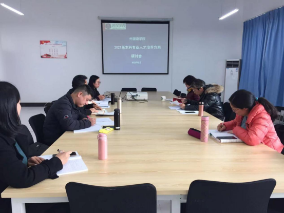 3月9日下午,外国语学院在学院会议室召开了英语专业、商务英语专业2021版人才培养方案制定研讨会。会议由外国语学院院长曹曼主持,副院长夏胜武,英语系、商务英语系系主任,教研室主任参加会议。
