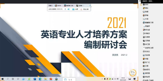 为进一步贯彻习近平总书记关于教育的重要论述和全国教育大会、本科教育工作会议精神,落实教育部《关于深化本科教育教学改革全面提高人才培养质量的意见》(教高〔2019〕6号)和《普通高等学校本科专业类教学质量国家标准(2018年)》要求,进一步深化教育教学改革,高质量完成我校2021级专业人才培养方案制定工作, 外国语学院英语系于2月8日晚19点30分在该系工作QQ群里召开了2021版英语专业人才培养方案研讨会。会议由英语系主任贺玲老师主持,英语系各教研室主任及全体教师参加了本次会议。