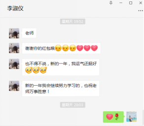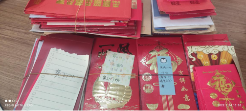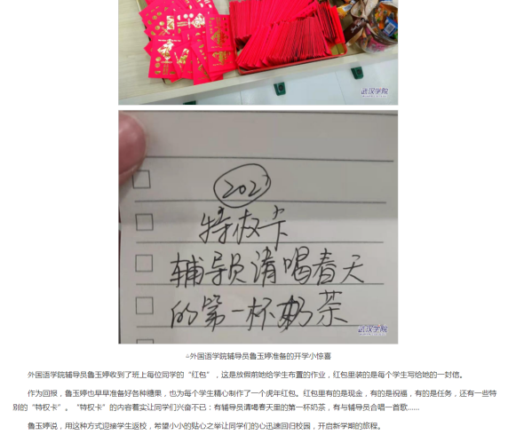 从布置寒假作业的那一刻,鲁老师就开始策划如何“回报”学生。深受曹曼院长和曹辉书记日常的温暖举动,她有了“虎年红包”的想法,于是她精心为每个学生精心准备了“别样”虎年红包,有现金红包、祝福红包和特权红包。现金红包有20元的、10元的和5元的三种不同的金额,也是压岁包,希望抽到的同学岁岁平安!祝福红包是鲁老师亲手写的20多种祝福语,有跟学习相关的“拿奖拿到手软”,也有跟生活相关的“新年暴富、暴美、暴帅”,每一个字都带着她最真诚的祝福。特权红包是专属红包,跟每个人的都不一样,也是最受学生喜爱的,如“辅导员请和春天的第一杯奶茶”、“合理的事假权限一次”。她还为200多名学生准备了“棒棒糖”,寓意“新年甜甜蜜蜜,生活棒棒哒”。