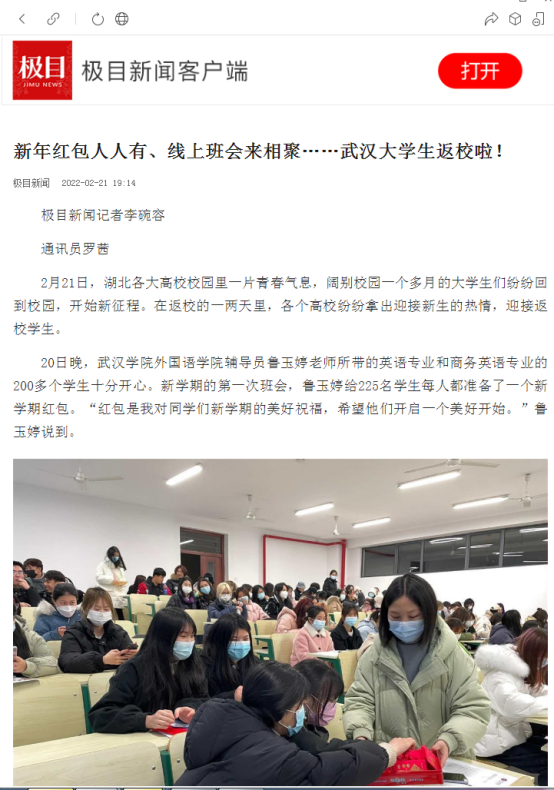 2月20日晚,外国语学院辅导员鲁玉婷的“花式”班会,让刚刚返校的学生直呼辅导员太暖心了!新学期的第一次班会,鲁老师收到了班上同学每个人的“红包”,这是放假前她给学生布置的作业,红包里装的是每个学生写给未来的自己的一封信。