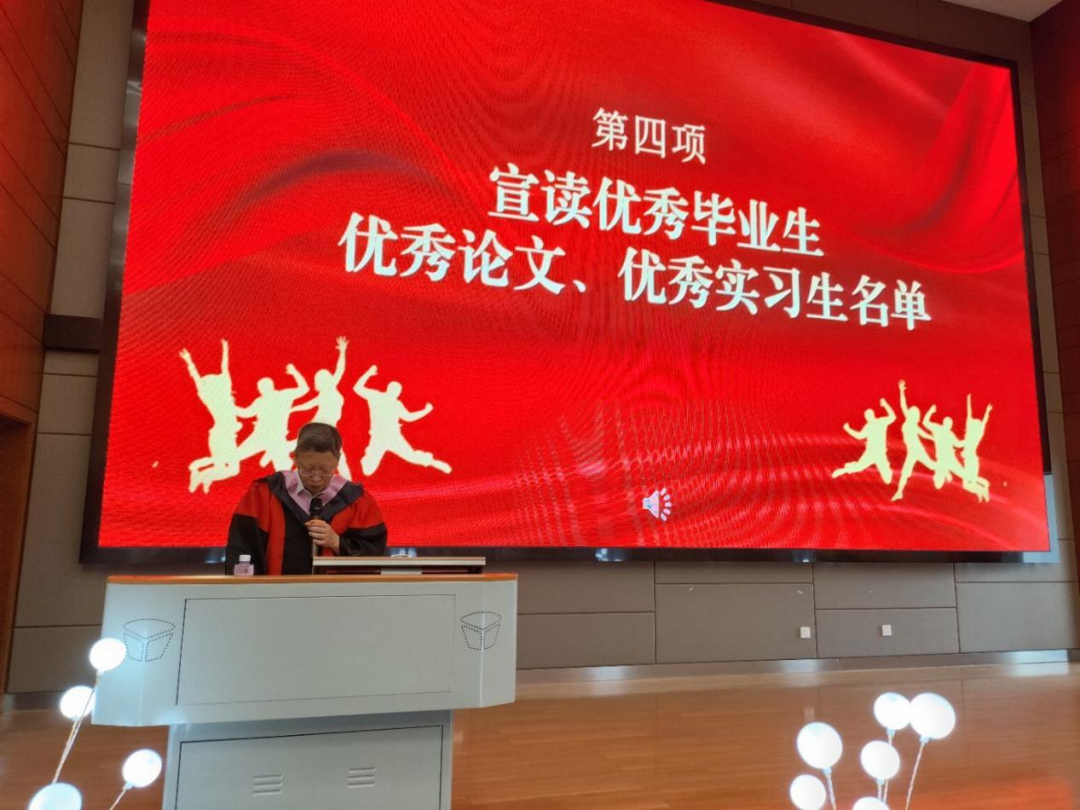 外国语学院副院长夏胜武宣读了获表彰学生名单,其中裴文思等74人获校优级秀毕业生荣誉称号、罗晨琳等16人的毕业论文被评为优秀毕业论文、杨艺红等18人获优秀实习生荣誉称号;科研处处长吴斐为考取国内外大学研究生的19名同学颁发了“外国语学院考研先进个人”荣誉证书;学生工作处处长李世峰为积极带头就业的10名毕业生颁发了“外国语学院就业先进个人”荣誉证书;学生工作处副处长戚兰为2022届各班校友联络员颁发了聘书。