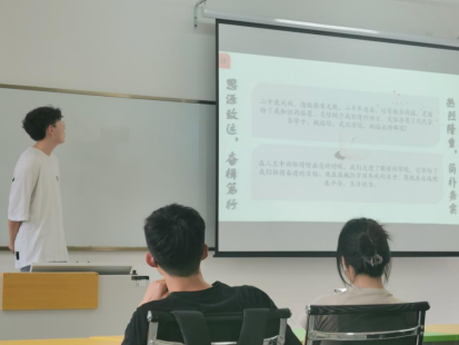 本次主题班会分为“学校简介”、“校徽校歌”、“校园生活”和“校庆祝福”四个板块。会议伊始,李雲鹤同学先向同学们介绍了学校前身和转设时间,以及学校的占地面积、校舍等基本情况。紧接着,他详细讲解了校徽的寓意和学校吉祥物“呦呦”、“沐沐”的出处,让大家知道了其中所蕴含的“朝气希望、纳迎四方;沐浴教化、蕴养才识”的美好寓意。同时还他还带着大家重温了武院校歌,让大家更加深切地体会到这首歌中所蕴藏的年轻人最热血沸腾的青春和最灿烂辉煌的梦想。随后他分享了近期话剧大赛、第十三届读书月活动等丰富的校园活动。