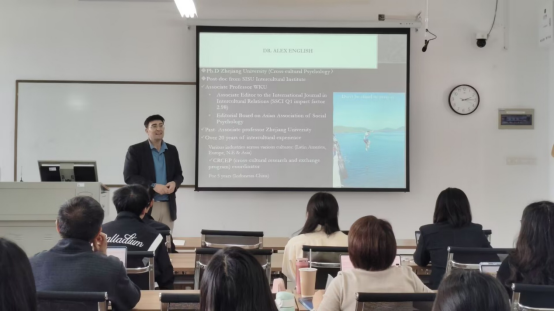 4月17日,外国语学院特邀SSCI期刊《International Journal of Intercultural Relations》副主编、温州肯恩大学副教授、浙江大学应用心理学博士Dr. Alex English开展学术讲座,讲座主题为“如何在AI时代发表高质量论文——作为作者和副主编的经验之谈”。讲座由外国语学院院长陈金平教授主持,全院专任教师参加。